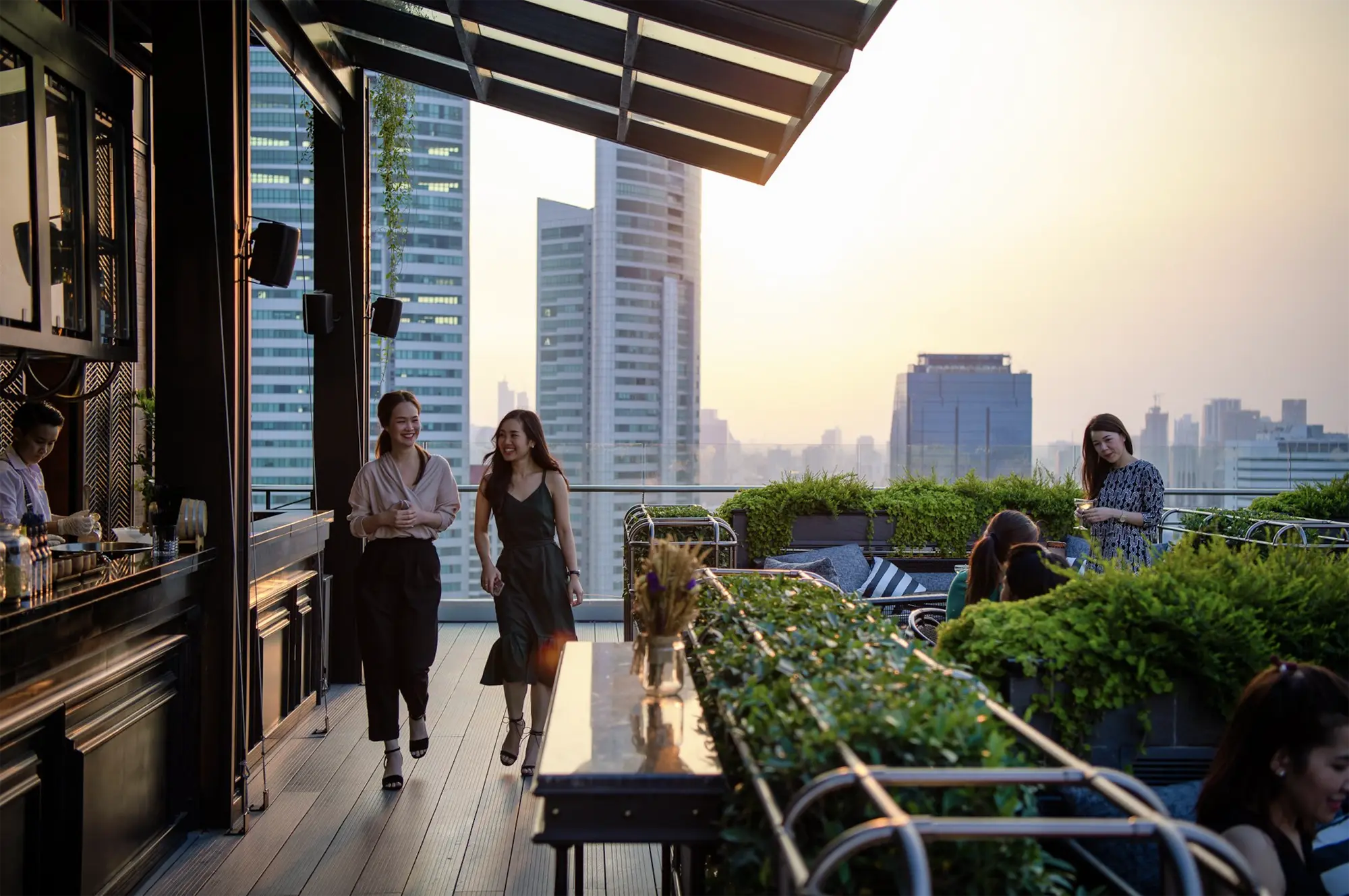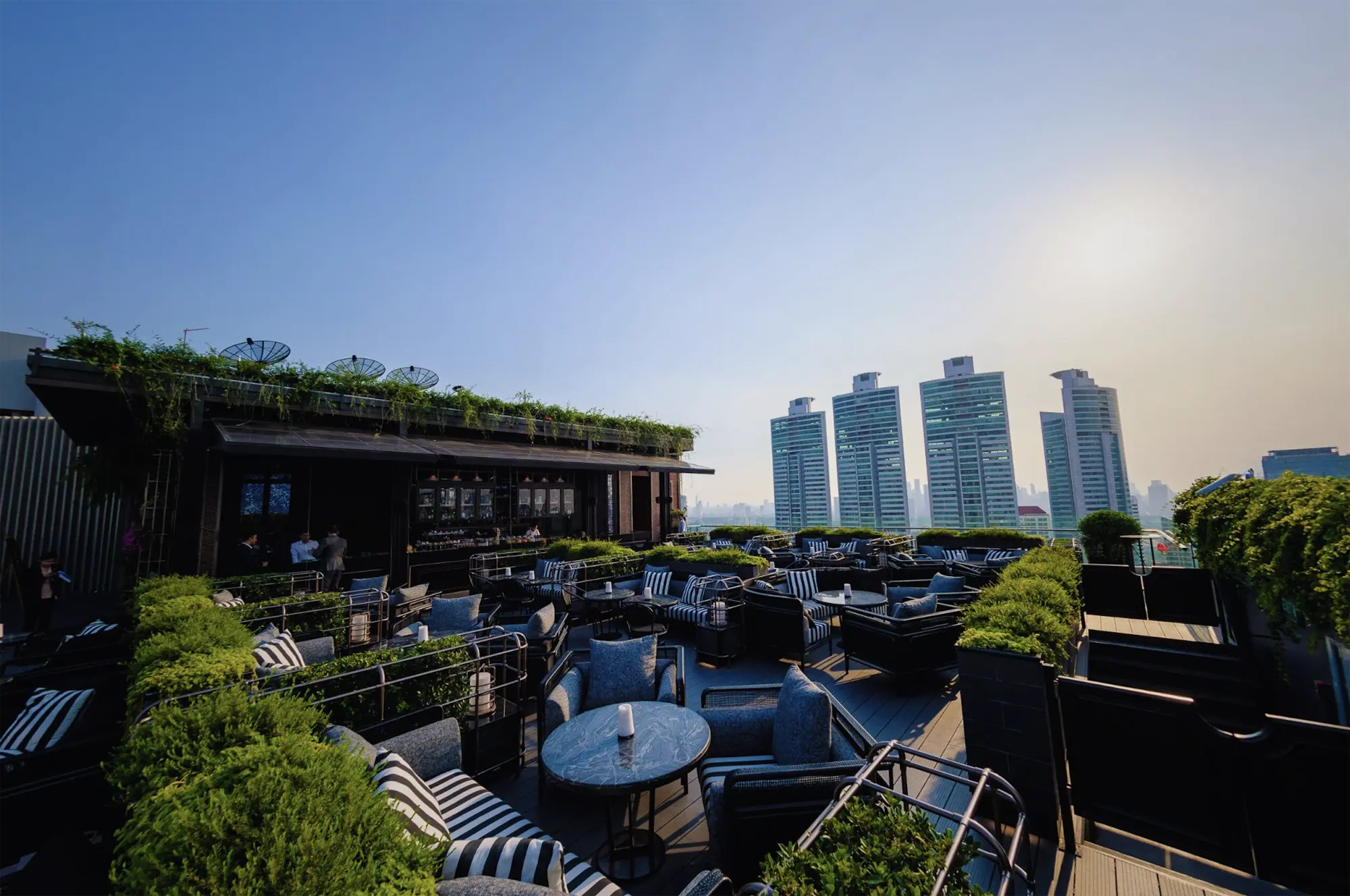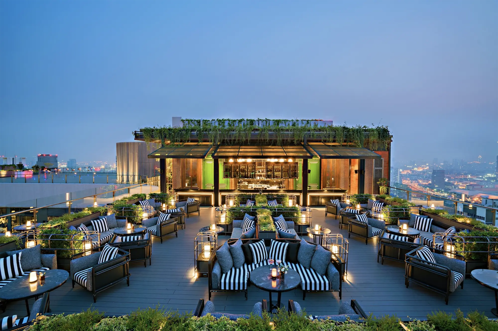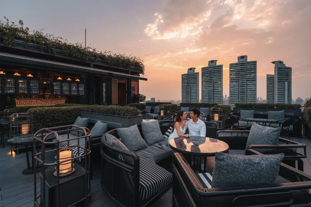 ABar Rooftop is an open air bar and restaurant where Bangkok’s skyline can be seen stretching in every direction. Set high above the bustle of Sukhumvit Road, the venue pairs modern design with soft lighting, leafy touches, and plush seating that’s perfect for sunset dates or late-night conversations.
