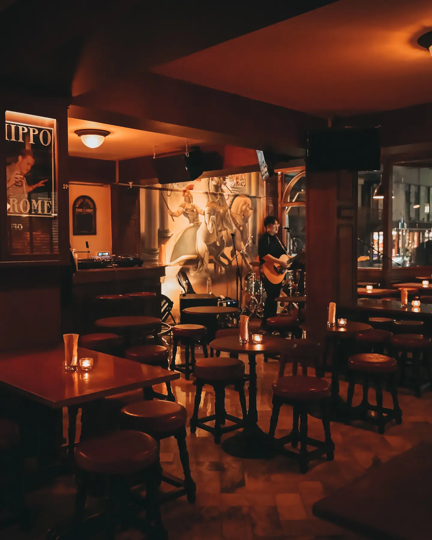 Hippodrome brings a touch of old-world charm to Bangkok’s modern nightlife. The bar’s interior features polished wood, marble accents, and striking Roman-inspired artwork, creating an inviting atmosphere. Guests can sip on a cocktail while enjoying a mix of pop and Thai music.