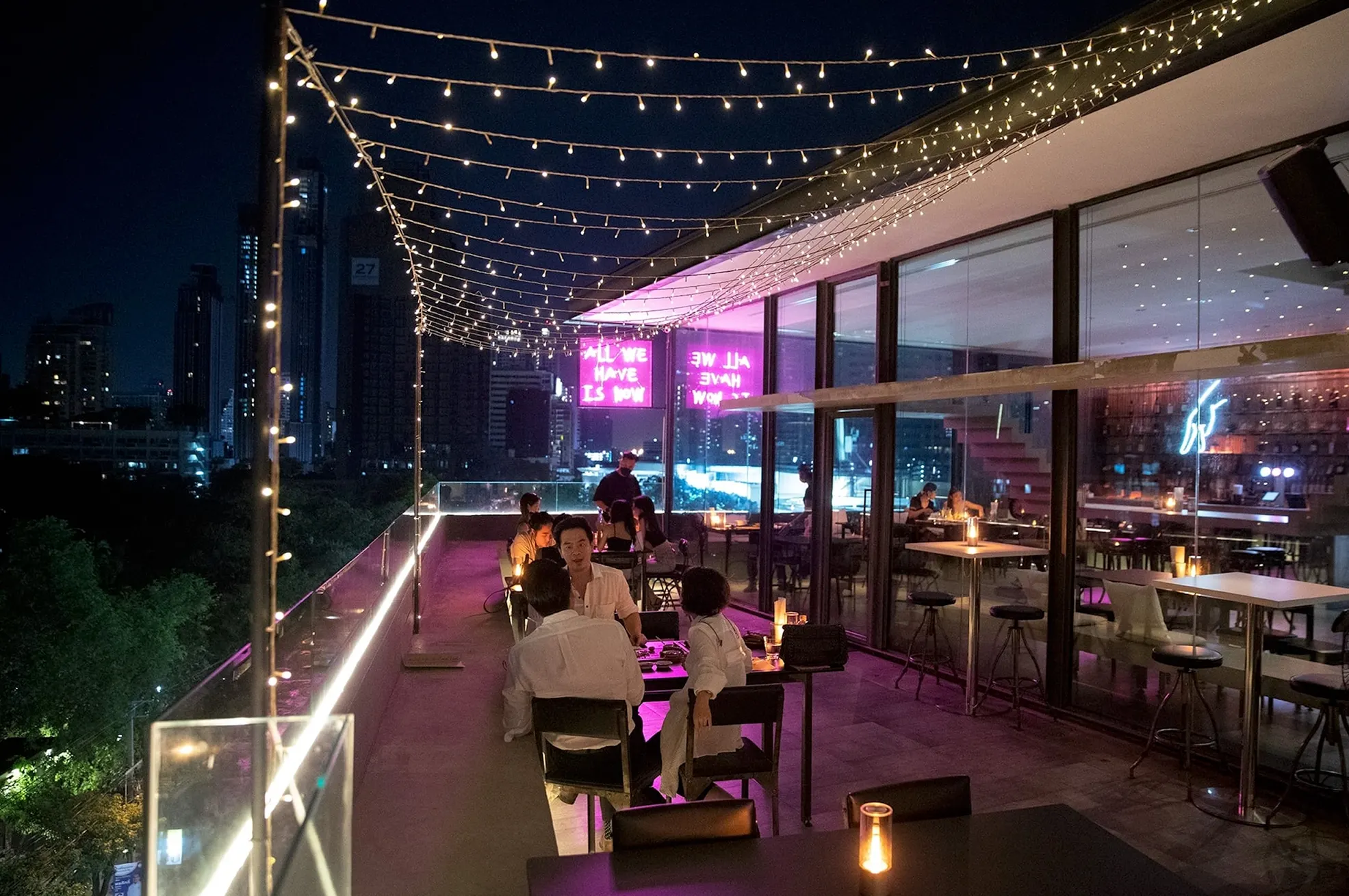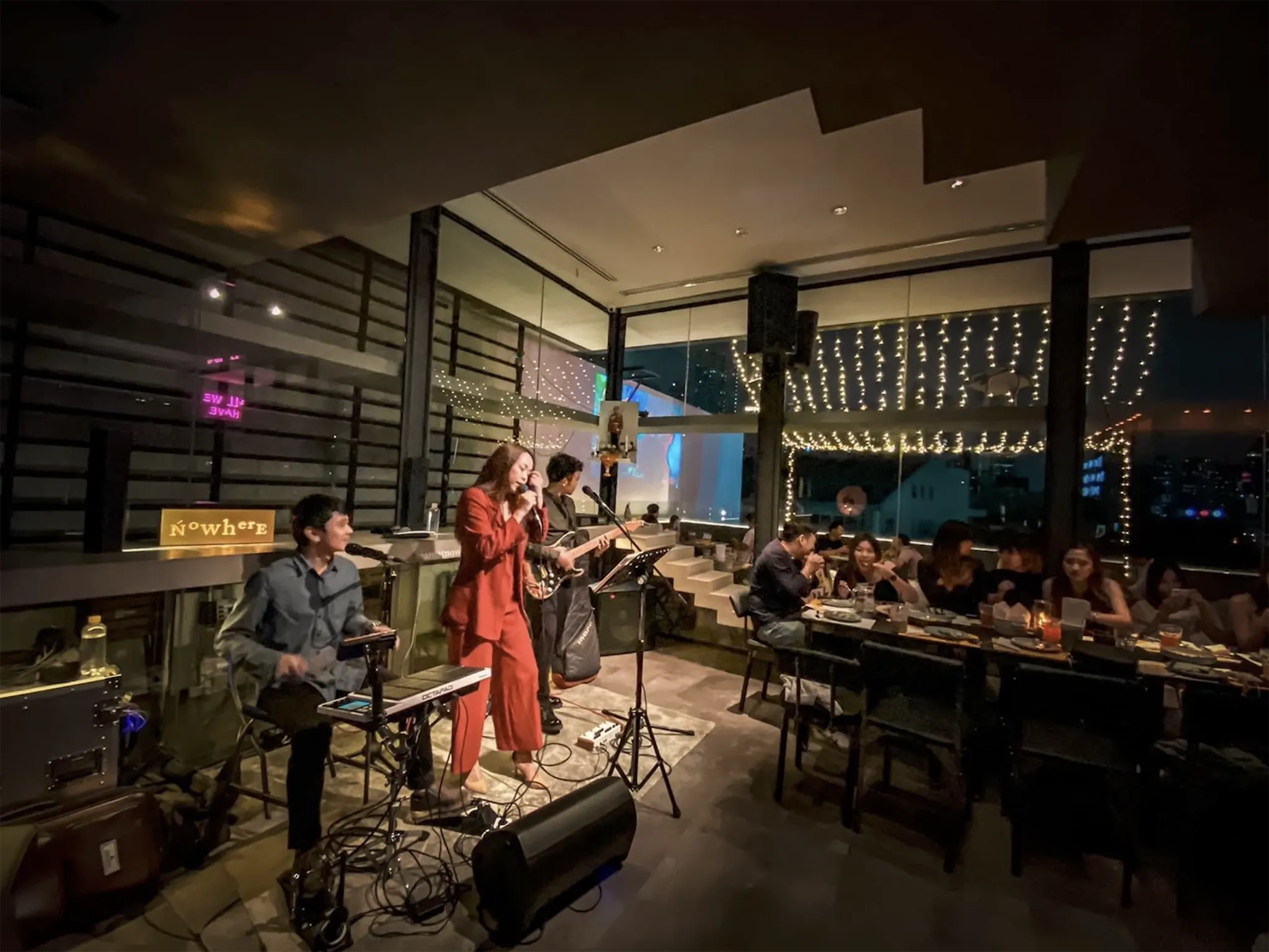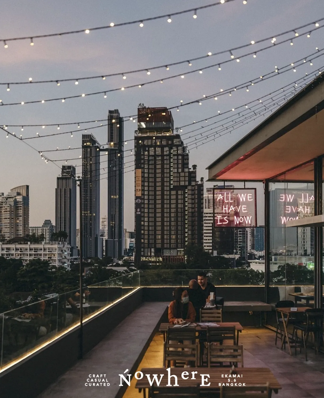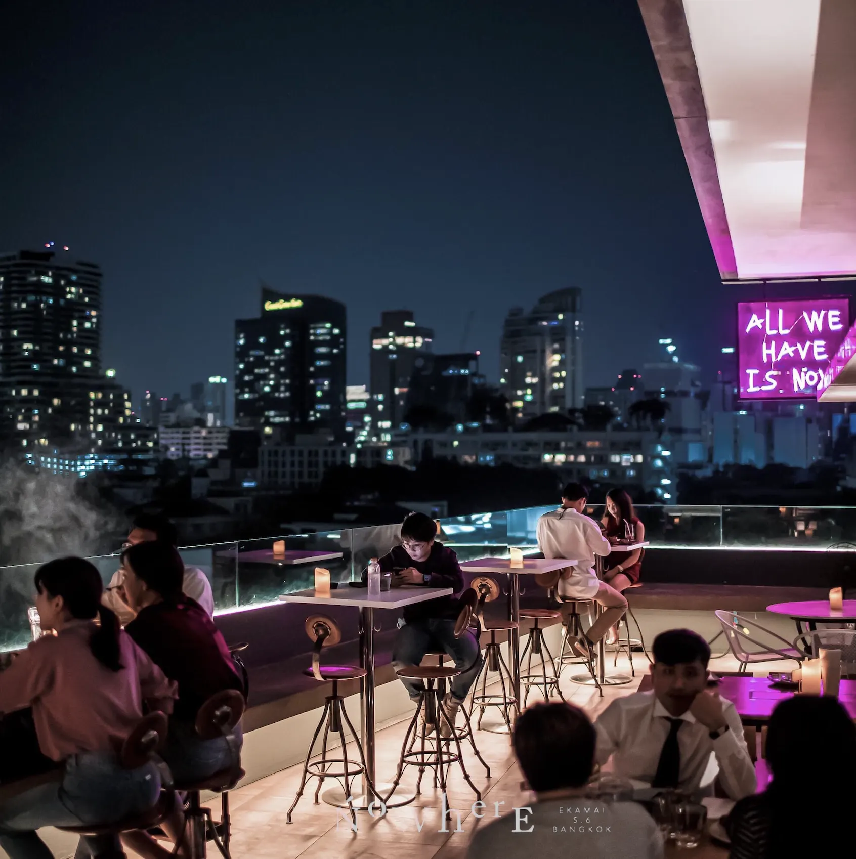 Nowhere is a stylish rooftop bar and restaurant offering a relaxed yet refined atmosphere. With its minimalist design featuring bare concrete steps and floor-to-ceiling windows, the venue provides unobstructed 180-degree views of the Ekkamai and Thonglor neighborhoods. The menu showcases Eurasian fusion cuisine, including standout dishes like the Moo Ping Pâté served with English muffins and pickled vegetables, and the watermelon salad with bonito flakes and sumac vinaigrette. Complementing the culinary offerings are inventive cocktails, such as the chorizo oil-infused “Julep from Nowhere,” alongside a selection of tea-based mocktails. Live music on select evenings and weekend boozy brunches enhance the vibrant yet intimate setting, making Nowhere BKK a hidden gem for those seeking a unique rooftop experience in Bangkok.